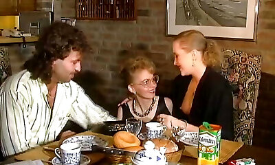 две сногсшибательные немецкие цыпочки делят заряженный член на кухонном столе