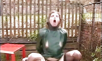 Kinky latex mistresses examine cunt of one plum chick outdoor
