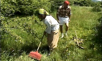 Blonde hottie gets fucked from behind in a forest in retro flick
