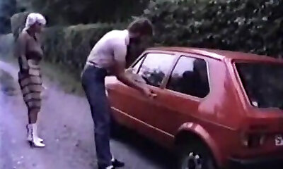Beautiful classic busty blondie in the van gives head to her guy
